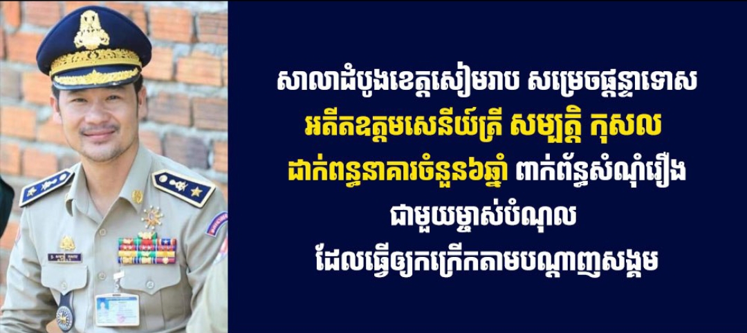 សាលាដំបូងខេត្តសៀមរាប សម្រេចផ្ដន្ទាទោសអតីតឧត្ដមសេនីយ៍ត្រី សម្បត្តិ កុសល ដាក់ពន្ធនាគារចំនួន៦ឆ្នាំ ពាក់ព័ន្ធសំណុំរឿងជាមួយម្ចាស់បំណុល ដែលធ្វើឲ្យកក្រើកតាមបណ្តាញសង្គម