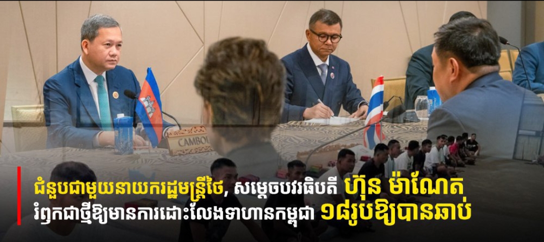 ភ្នំពេញ)៖ សម្តេចបវរធិបតី ហ៊ុន ម៉ាណែត នាយករដ្ឋមន្ត្រីកម្ពុជា បានរំឭកជាថ្មីនូវការអំពាវនាវឱ្យថៃដោះលែងទាហានកម្ពុជា ចំនួន ១៨រូបឱ្យបានឆាប់ ដោយឈរលើមូលដ្ឋានមនុស្សធម៌ និងដូចដែលបានឯកភាពគ្នាក្នុងសេចក្តីថ្លែងការណ អានបន្ត