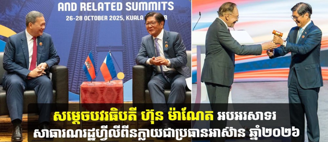 (ភ្នំពេញ)៖ ភ្លាមៗបន្ទាប់ពីលោក អាន់វ៉ា អ៉ីប្រាហ៉ីម នាយករដ្ឋមន្ត្រីម៉ាឡេស៉ី និងជាប្រធានអាស៊ាន ឆ្នាំ២០២៥ បានប្រគល់ញញួរប្រធានអាស៊ានប្តូរវេន ដល់ប្រធានាធិបតីហ្វីលីពីន, នៅរសៀលថ្ងៃទី២៨ ខែតុលានេះ សម្តេចបវរធិបត អានបន្ត