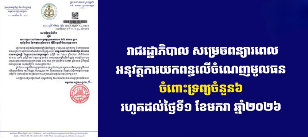 ភ្នំពេញ)៖ រាជរដ្ឋាភិបាលកម្ពុជា តាមរយៈក្រសួងសេដ្ឋកិច្ច និងហិរញ្ញវត្ថុ បានសម្រេចពន្យារពេលអនុវត្តការយកពន្ធលើចំណេញមូលធន ចំពោះទ្រព្យទាំង ៦ រហូតដល់ថ្ងៃទី១ ខែមករា ឆ្នាំ២០២៦។ នេះបើយោងតាមសេចក្តីជូនដំណឹងរបស់អគ្ អានបន្ត