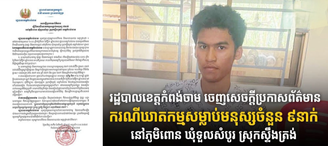 រដ្ឋបាលខេត្តកំពង់ចាម ចេញសេចក្តីប្រកាសព័ត៌មានករណីឃាតកម្មសម្លាប់មនុស្សចំនួន ៩នាក់ នៅភូមិពោន ឃុំទួលសំបូរ ស្រុកស្ទឹងត្រង់
