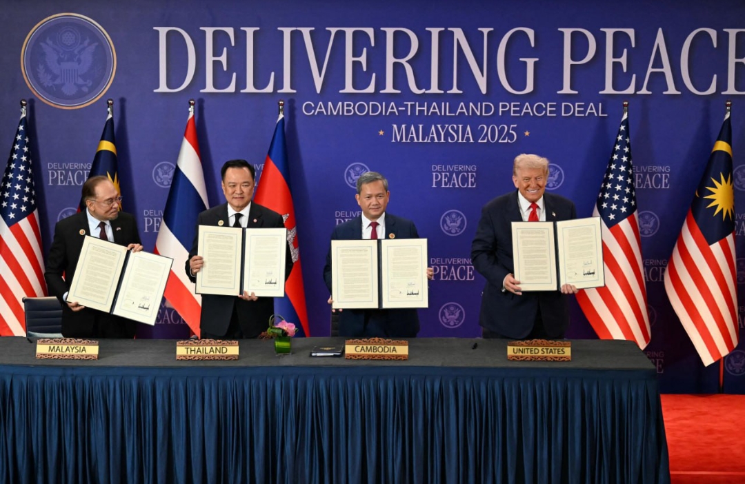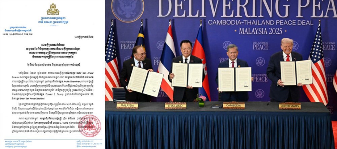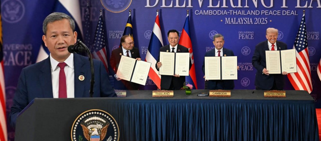 កិច្ចព្រមព្រៀងសន្តិភាពកម្ពុជា-ថៃ ត្រូវបានចុះហត្ថលេខារួចហើយ ដោយនាយករដ្ឋមន្រ្តីប្រទេសទាំងពីរ ក្រោមអធិបតីភាព ប្រធានាធិបតីអាមេរិក និងវត្តមាននាយករដ្ឋមន្រ្តីម៉ាឡេស៊ី អំឡុងកិច្ចប្រជុំកំពូលអាស៊ាន